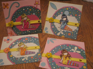 Meanwhile, I made these cards from a design I scraplifted from Cards magazine March 2010 issue. I used papers from HobbyLobby, Cosmo Cricket and Bazill. I colored my Sitting Gorjuss girl with Copics and cut her out, adhering her with dimensional dots over a piece of yellow cloth binding tape and a shape cut with my Epic Six and a Spellbinders Nestability die. I added very subtle glitz with a metallic gel pen and a couple jewels. The card measures 6x6 and is undecorated in the inside because I gave it away to a fellow crafter to use as she pleases, for a birthday, a get weel or a friendship card.
