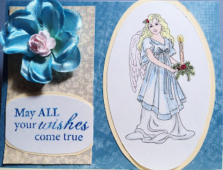 I wanted to incorporate the season with the celebration, so I used Squigglefly's Angel With Candle by artist Inger Harding. I chose pale colors from my Copic collection with which to color the image, and framed her against a brighter blue patterned paper from CTMH. I used my oval cutter from Fiskars to cut out the frame for the image and the sentiment.